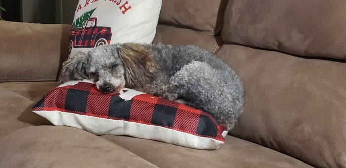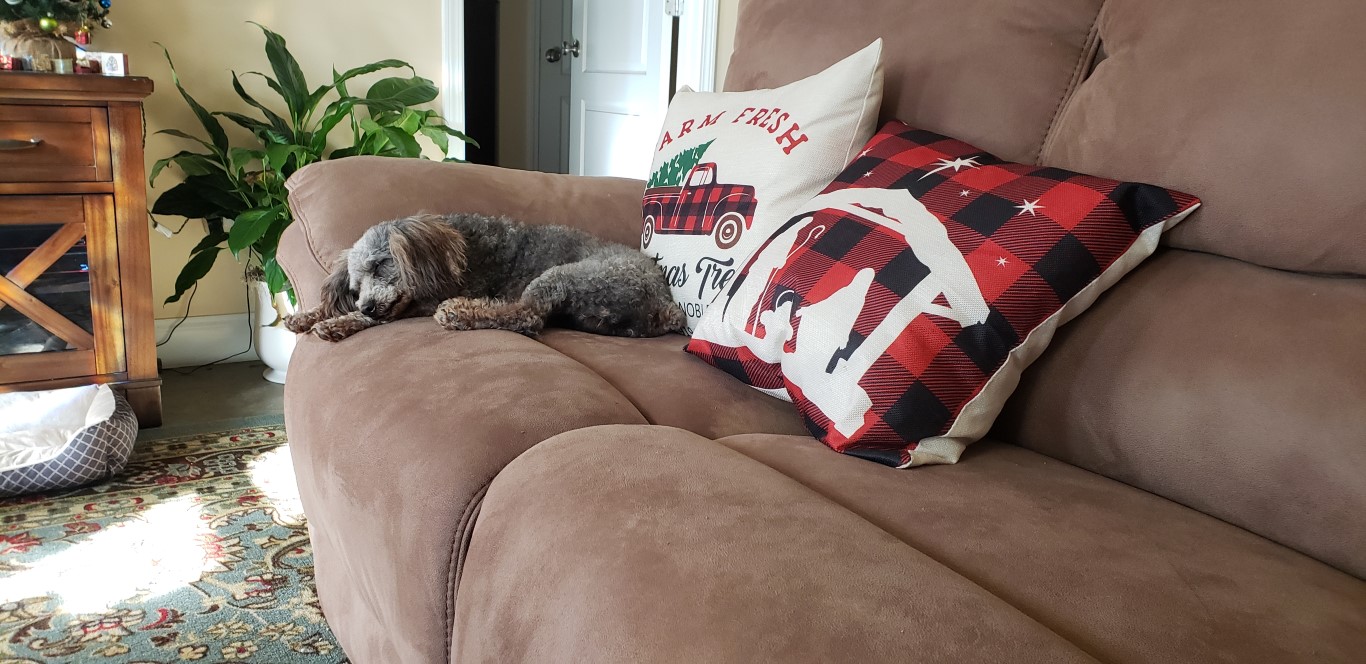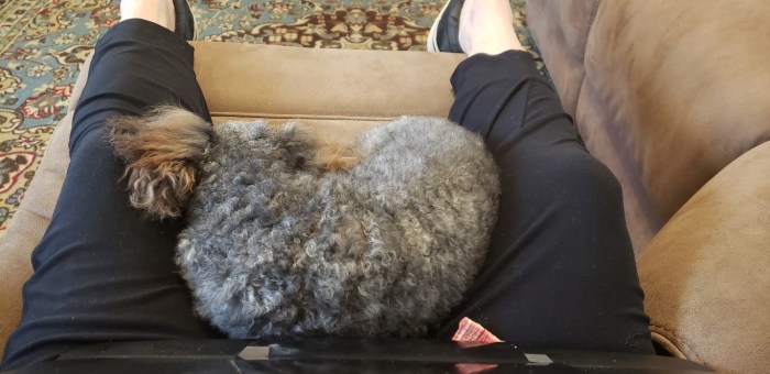 Buddy and I have been bonding today and he seems to really love being my little buddy. He’s found his spot on the foot of the recliner.