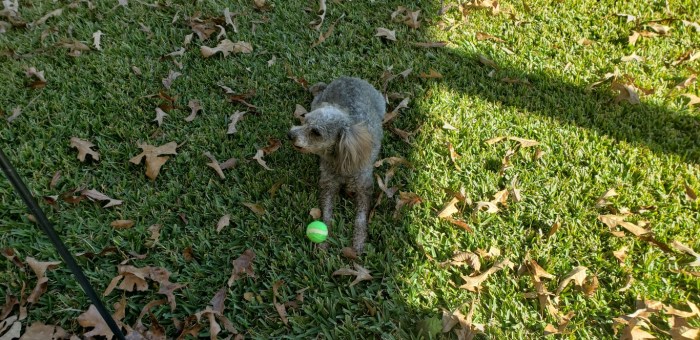 The first thing I noticed was he understands sit, stay, stop, and put the ball down.  He does them without having to be told twice. He also immediately peed when he got down in the grass, yay! I put him in the fenced-in area we had for Samson and he immediately jumped over the fence! That will have to be changed! He’s very good at fetching a thrown ball and we did that a lot today. He really loves having a small tennis ball thrown so he can run to get it and bring it back to me.