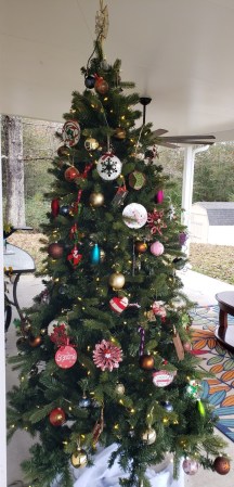 Some of the ornaments my grandchildren previously made for me, all the ones I made this year involving some of Roy’s small things (Roy’s small calculator he used when he installed carpet back in the day, and ones my friend Cindy gave me are now on the tree. I shared a few of those ornaments in a previous post. I added some artsy, crafty bling to some of the plain ornaments, decorated some seashells, some computer CDs, and hard drive disks. I plan to make more of these CD disks and hard drive disk decorations this coming year for next year’s Christmas tree.