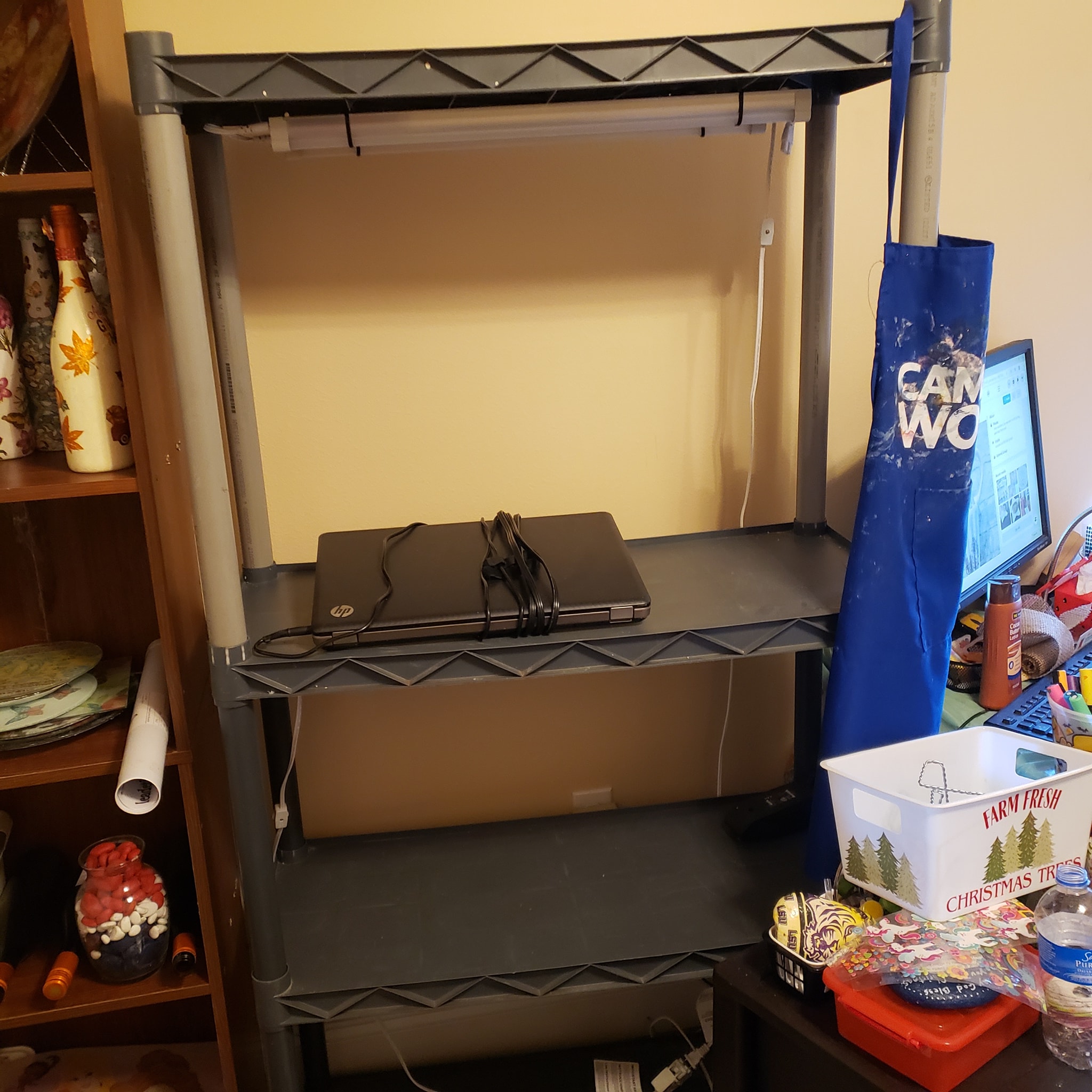 During the good day I emptied one of my shelving units and plan to sell it as a vegetable/plant seed growing unit since it has plant growing lights under each shelf. It has a timer that worked perfectly with the lights earlier this year for growing Roy’s little seeds into healthy plants ready for planting outside. The unit will be for sale soon. I’m trying to figure out how much we had invested in it so I’ll know how much to ask.