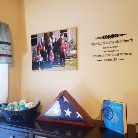 One of the walls in my bedroom has been empty since we moved in almost 3 years ago. I wanted the first thing I’d see when I woke up to be our family portrait we took two years ago. It all finally came together and my roomate (!) son Chip hung up the canvas print. He also applied on the wall next to that the beginning and end of Psalm 23rd which was Roy’s favorite scripture. Roy’s flag is now in a case and is on the dresser on that wall.