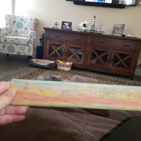 These are the things my grandchildren painted and made for me. It’s hard to see what the wooden stick is in the picture. It is our pond with the water at the bottom, the red clay dirt above, dying grass and green trees above that, and then the sky at the top! Every time one of them would bring their creation to me I just loved it. The brown rock is a football!