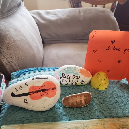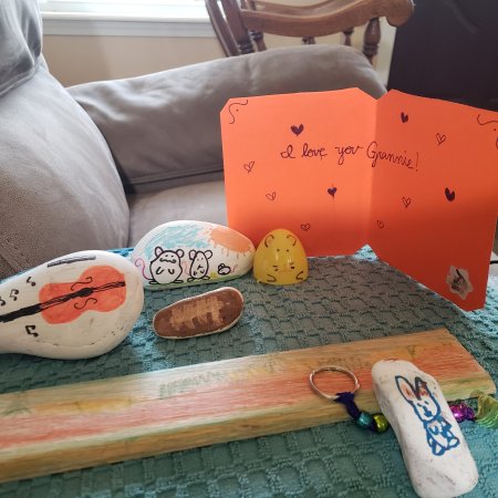 These are the things my grandchildren painted and made for me. It’s hard to see what the wooden stick is in the picture. It is our pond with the water at the bottom, the red clay dirt above, dying grass and green trees above that, and then the sky at the top! Every time one of them would bring their creation to me I just loved it. The brown rock is a football!
