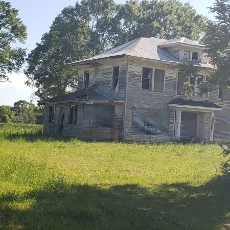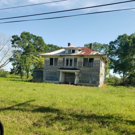 There is a house in the middle of all the brush and trees. It looked to have been abandoned years ago and was crumbling.