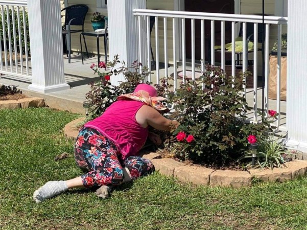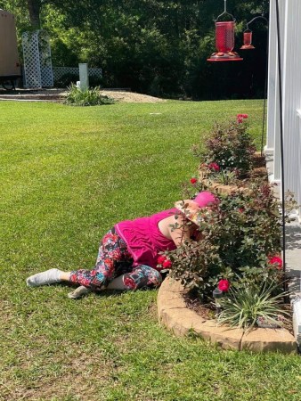 A friend of mine, Cindy Vernon had surgery recently. Since she was not able to pull weeds in her garden, guess who was happy to help. The weed lady, that’s me! I went over there a few times these past few weeks, pulled weeds, got filthy, and loved it! I call it playing in her yard! I’m planning on going back this week to finish up a long bed I started on. She said I could have some of her lilies that she has in a variety of colors. Chip took a picture of me the first time I went to play in her yard. Buddy got in on the picture too!