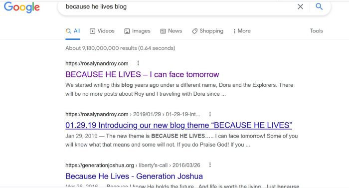 I took a picture of what is brought up on Google when typing in “Because He Lives Blog.” The blog name plus blog is at the highest of all search results. Each blog post doesn’t rank that high so that’s what I’m working on next.