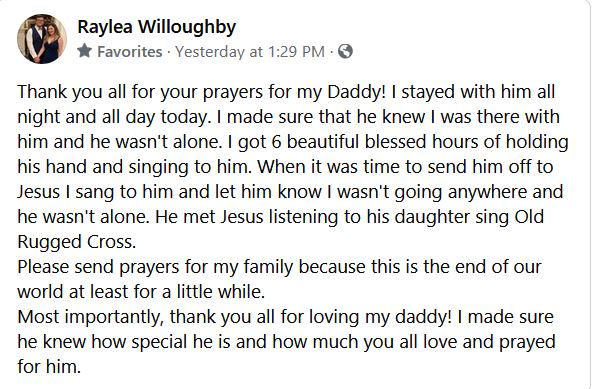 Rebecca’s precious husband and Raylea, Kaylon, and Gracyn’s daddy Donny Willoughby lost his struggle with COVID yesterday morning and went to live in Heaven eternally with his Lord and Savior. While, as a Christian, I know that is a beautiful thing to live eternally with God my heart is shattered over this loss for his wife Rebecca, their daughters Raylea, Kaylon, and Gracyn.