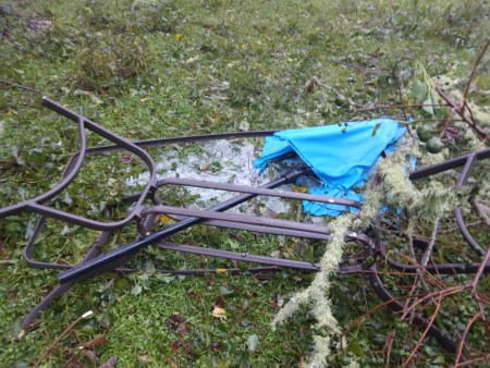 My glass top table we use for outside entertaining was shattered and the metal torn apart. The guys put the metal pieces out for trash pick up also. The shattered glass will be taken care of whenever we go back home.