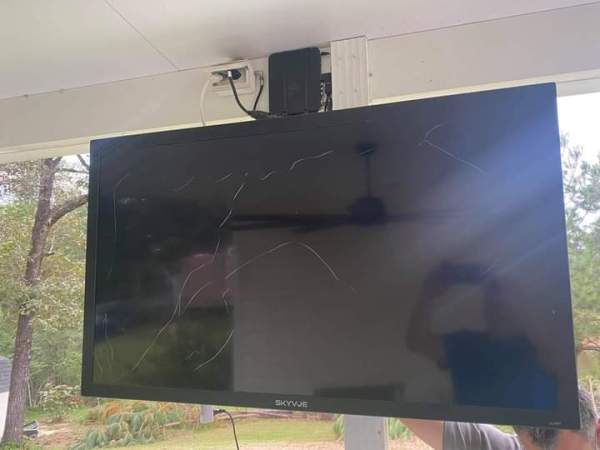 At the house in Amite along with srveral pine trees down it was discovered yesterday that the outside “wet” television under the patio is broken with cracks all over the screen and it does not work. Both of the big fans under the patio are no longer working.
