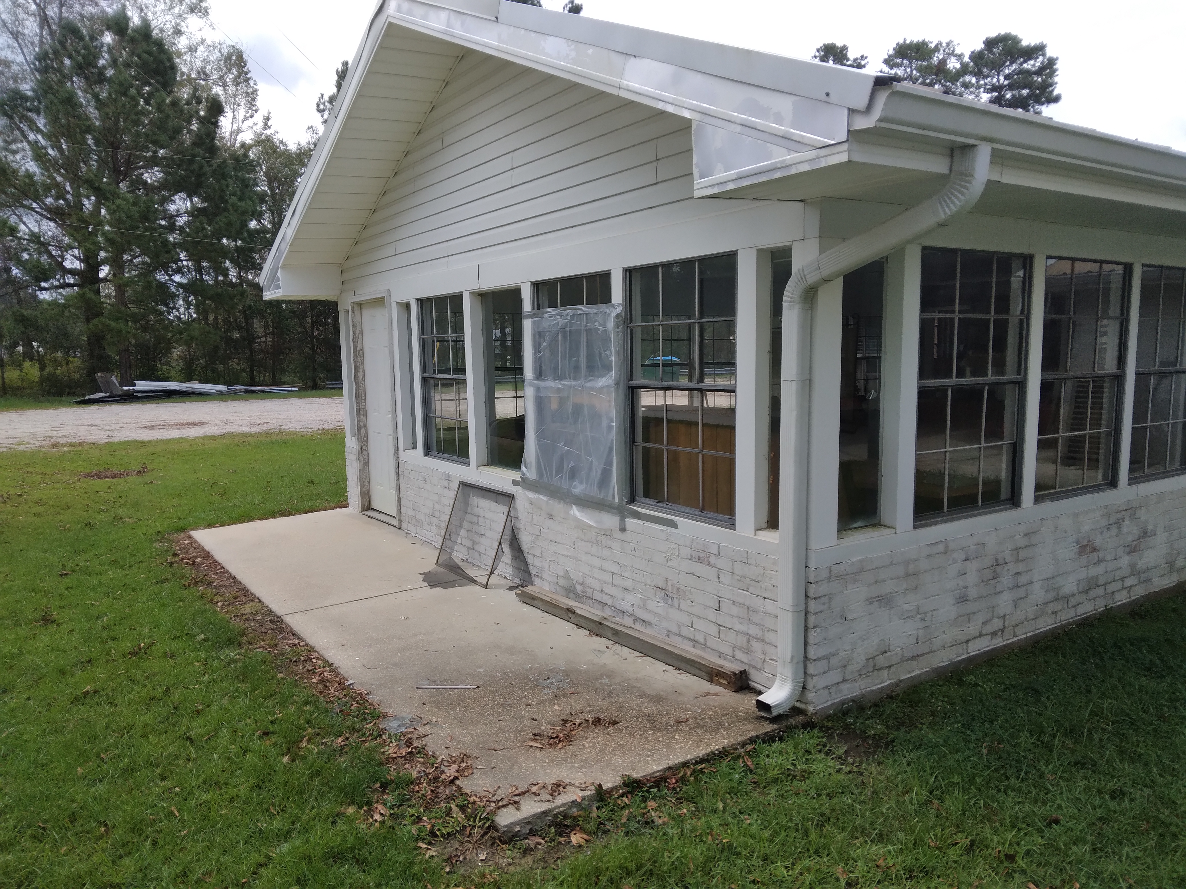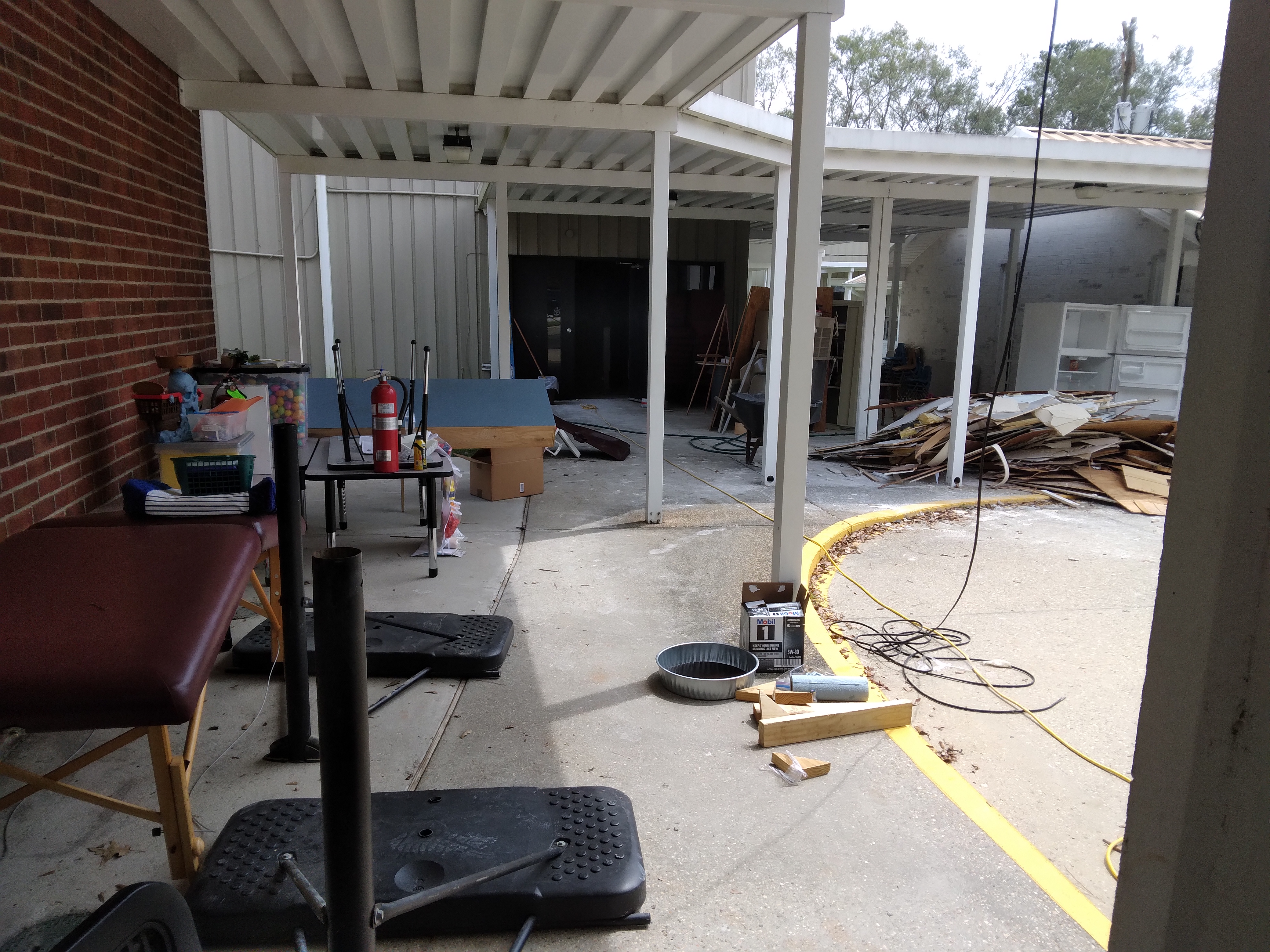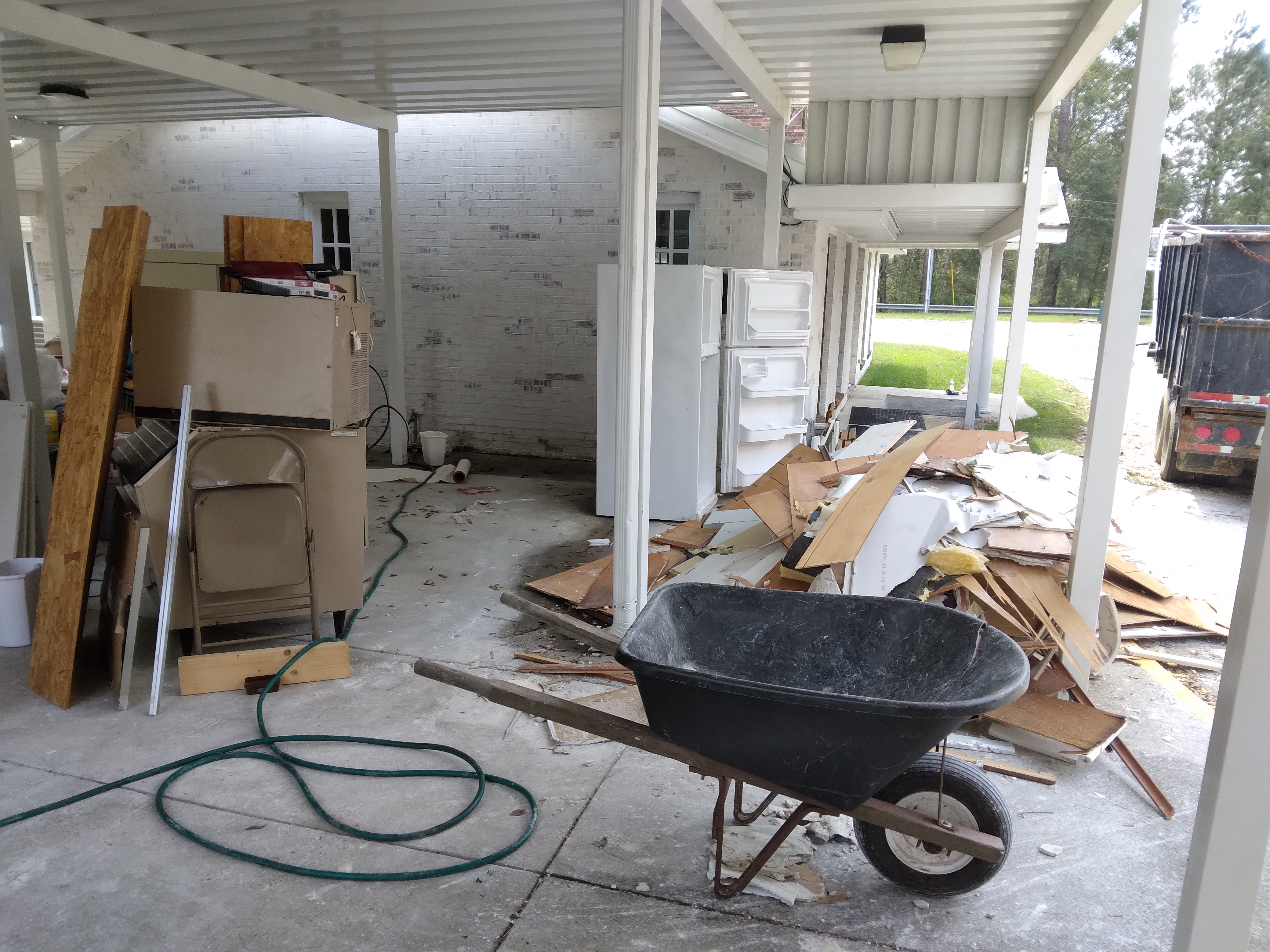 A friend of mine, the Pastor from Redemption Church Byron Brown, contacted me offering to bring a group. He brought a group to cut out all the damaged sheetrock from the education building and clean it up. They also cut the tree that had fallen in the back. They did an exceptional job.
