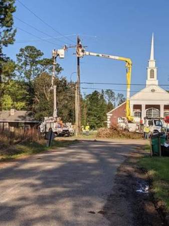 Electricity was restored to the church on September 15th or 16th. Getting power to that road required shutting down the I-55 for a period of time. The pole in front of the church has line coming in at angles making it a challenging repair and requiring multiple trucks and men to make the single repair that took hours.
