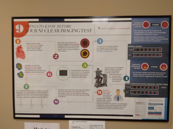 The new and improved Nuclear Stress test was first. Young folks walk/run on a treadmill. Old or injured folks don’t have do that. We sit. Frank is the Nuclear Imaging Specialist at Dr. Khoueiry’s office. He explained each step thoroughly. He also created the poster you’ll see below with the step by step information about how the test is done.