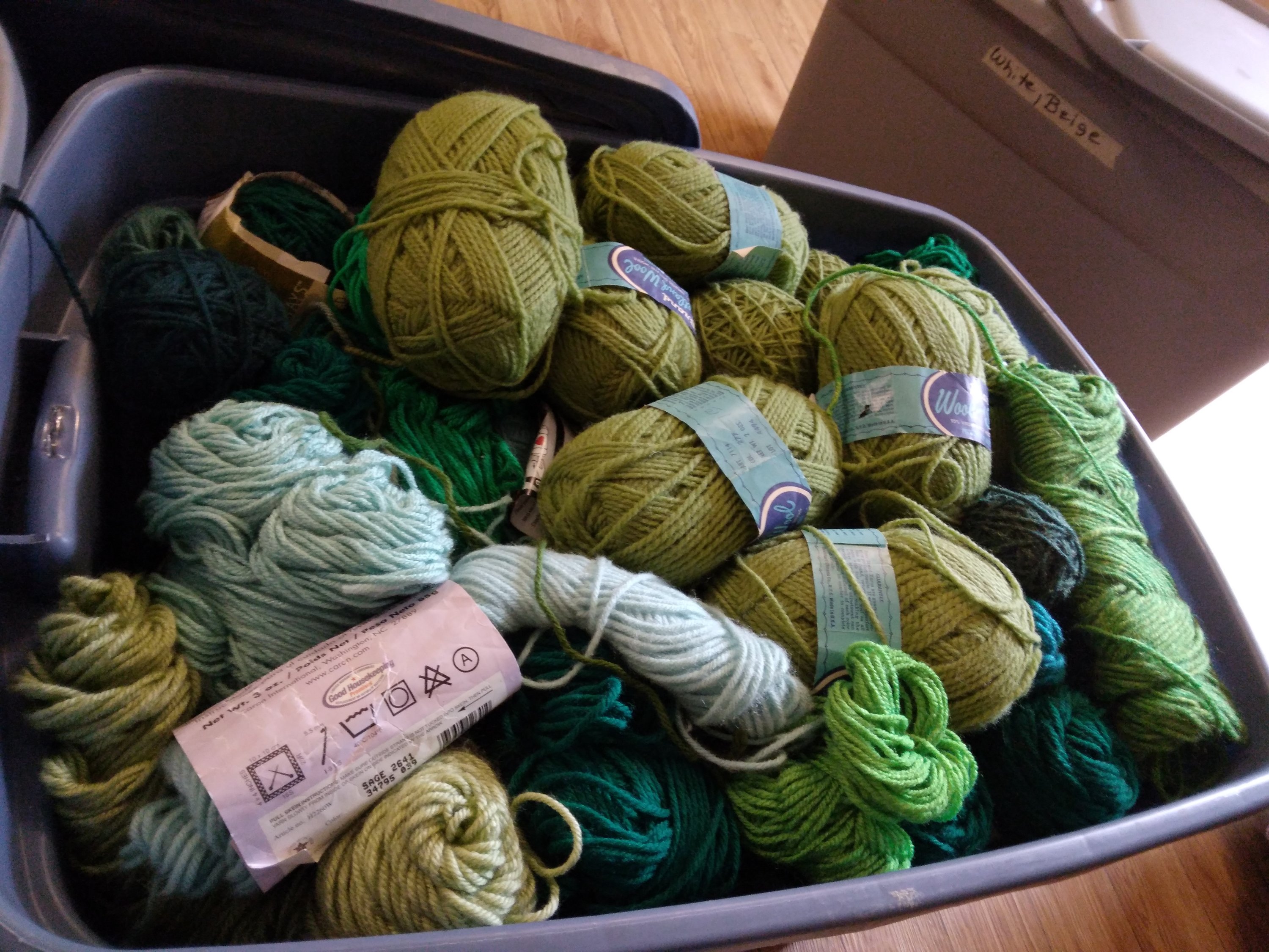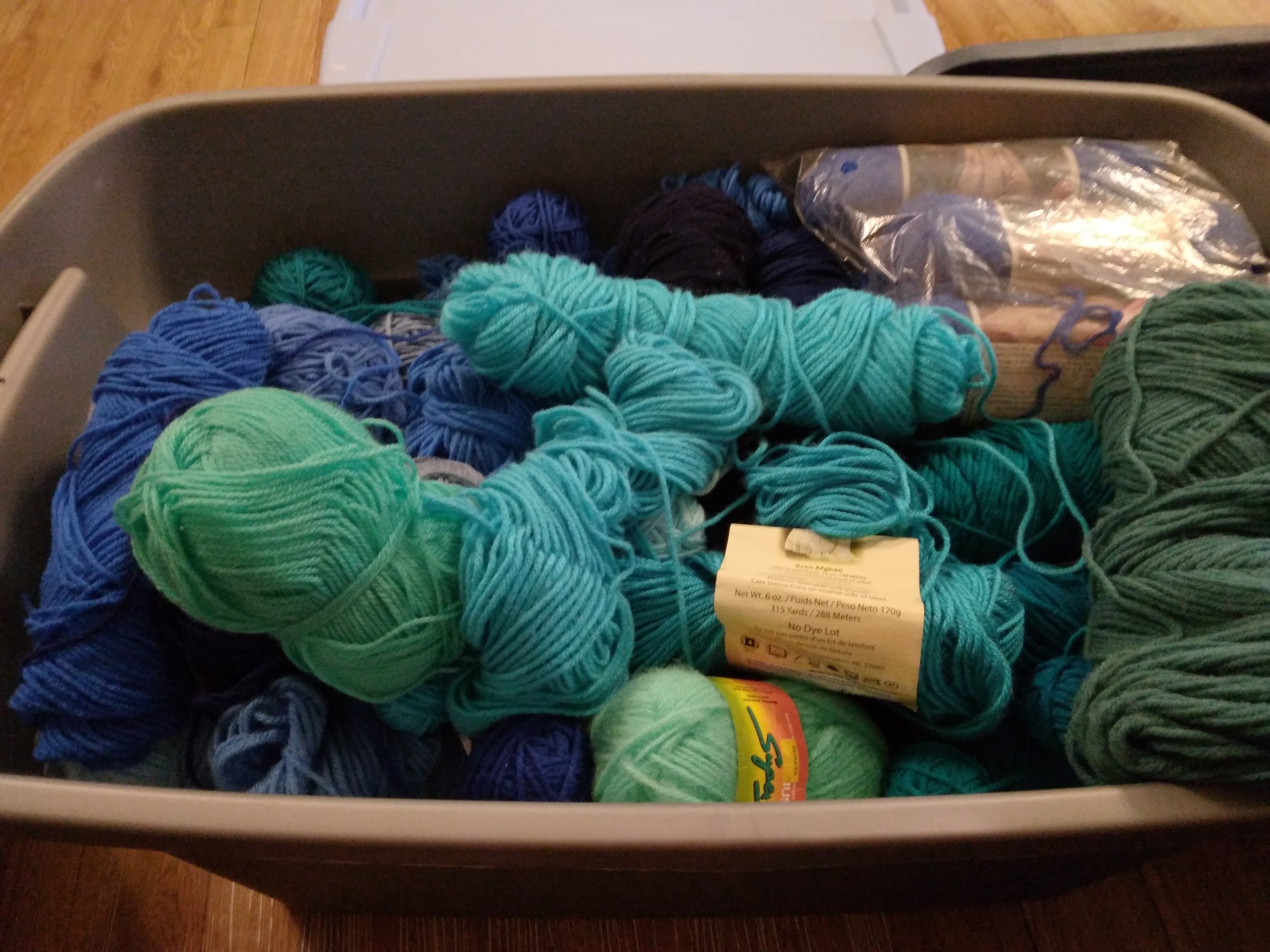 One day this week I visited with my friend Cindy Vernon. She made afghans for her sisters and is making one for me. I feel so privileged! She has several totes of yarn and I got to pick out the colors that I want in mine. She always amazes me with the quantity of EVERYTHING she has for crafts of all kinds. These is just a couple of the many totes filled with yarn.