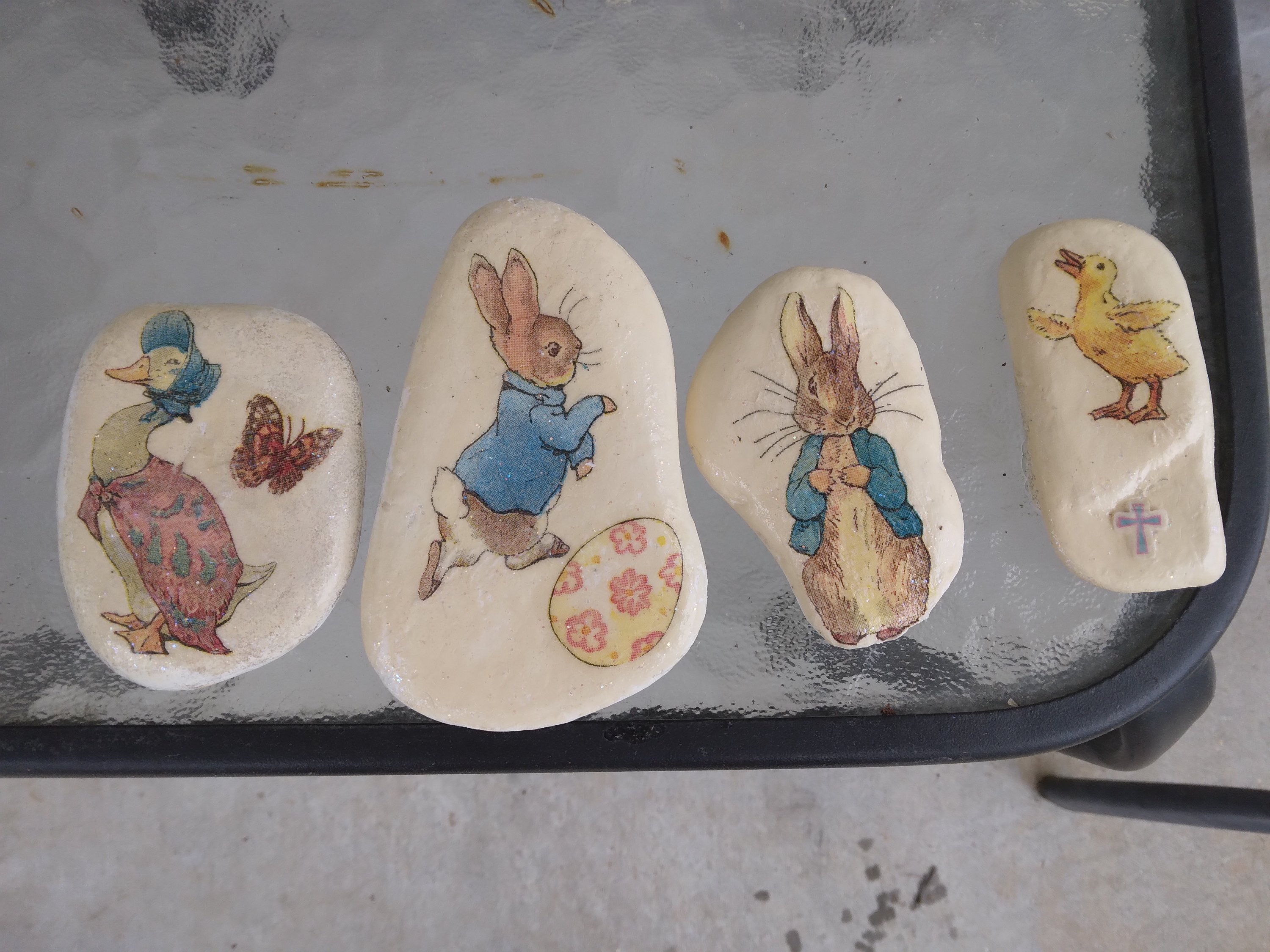 Another friend Cindy LeBlanc shares her napkin collection with me. How weird is it that my two good friends that share craft goodies with me are both named Cindy!!?? One of the napkins I fell in love with is an Easter napkin that she only had one single napkin. It’s perfect for small-medium rocks because I can cut out individual items to apply to the rock. These are some that I recently made and there is plenty of the napkin left to make more rocks!