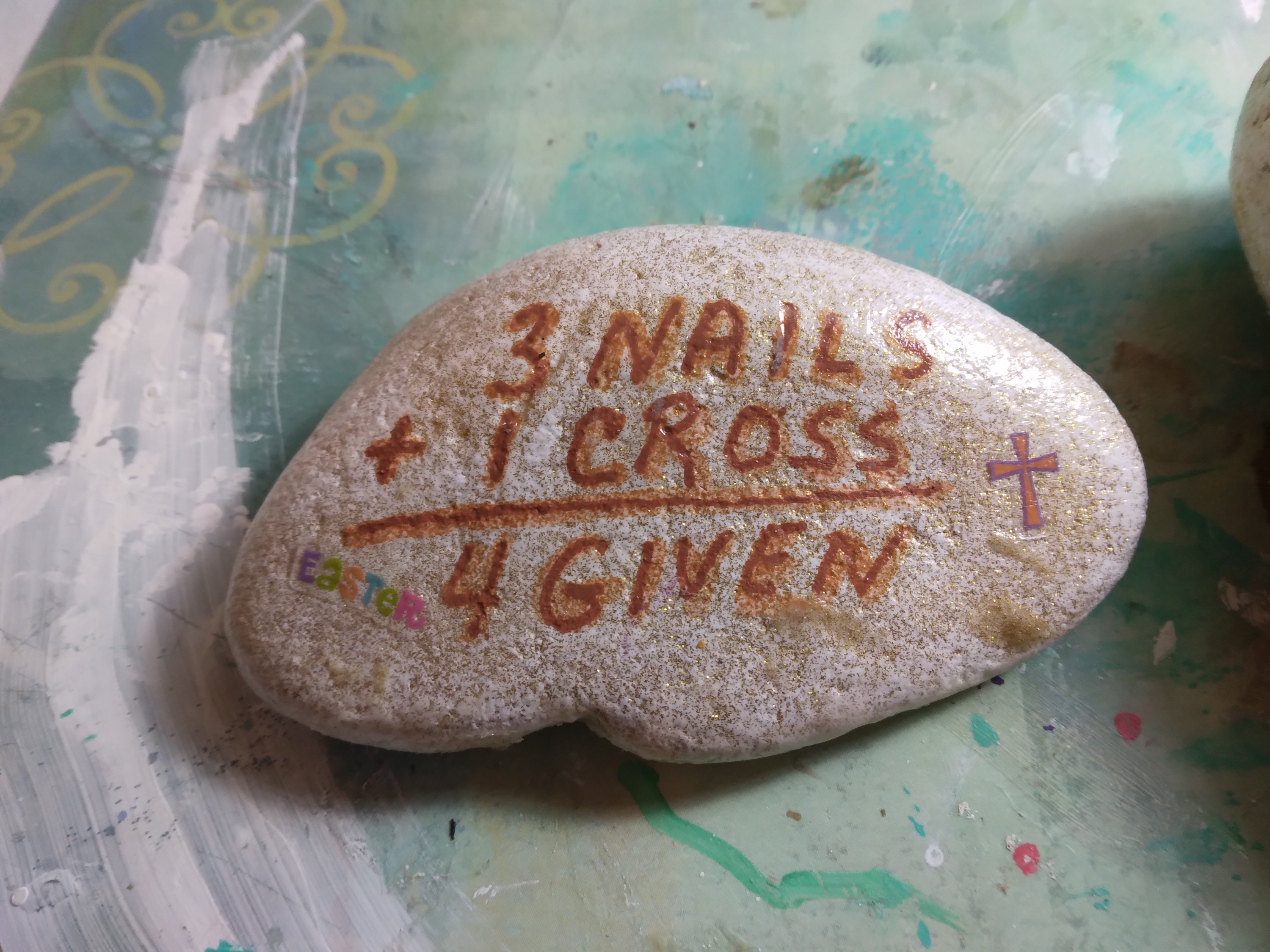It is that time again when I get to create some of my favorite rocks. See the first 2 rocks below. 3 NAILS + 1 CROSS EQUALS 4 GIVEN (FORGIVEN) which is a summary of what Jesus Christ endured for us on the cross to forgive our sins.