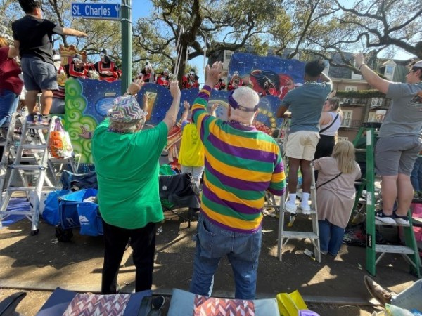 We came prepared to stay the whole day with two ladders for easier parade viewing, food and drinks in the ice chest, chairs, and more that I can’t think of right now. David dropped off us and all of that on St. Charles and parked a couple of blocks away.