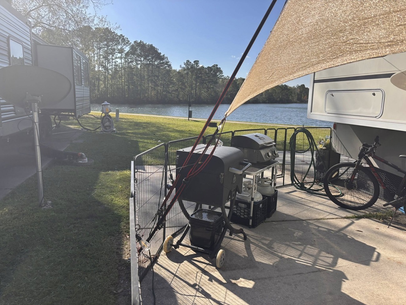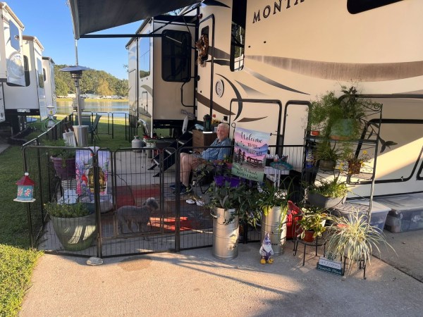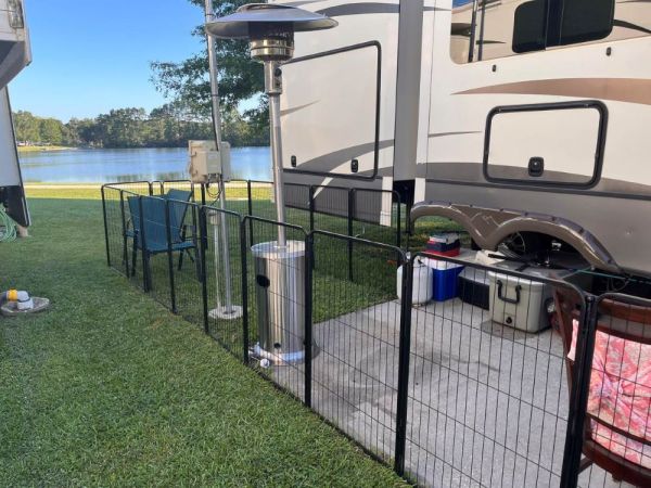 While driving around the park before we moved we saw a fenced in patio at an RV site down the road. It looked perfect for Buddy to still have some freedom to run around without a leash. I started looking for one and found a good price on a slightly used one in Slidell. We had not moved in yet so we stored it in our storage unit until we were ready to put it up.