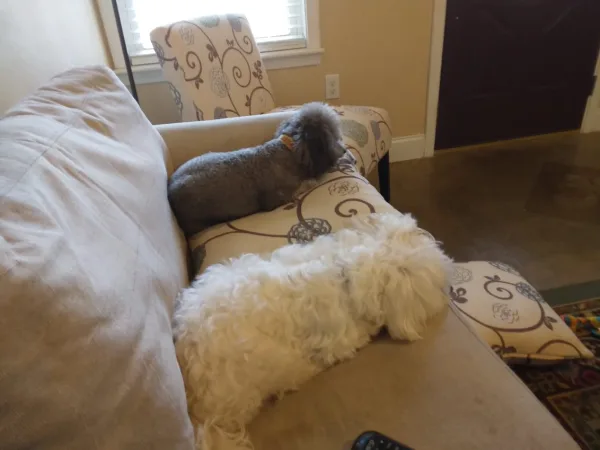 Buddy hasn’t tried to get out of his new fenced in play yard and we are very thankful for that. He’s made friends with Charlie the cat next door. They sniff each other through the fence and neither growls or hisses! He also has a dog friend on the other side. We left the gate open recently by accident. Where did Buddy go when he escaped? To see his doggie friend Lulu, our neighbor on the other side!