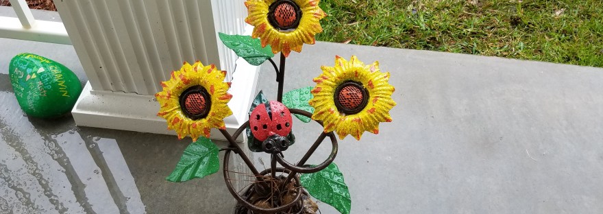 Since it's springtime and everything blooms afresh I am working on freshening up our metal yard art. The first two I've done are the three sunflowers with a lady bug and the single large flower. Before repainting: After repainting using brighter colors that make me happy! The big flower below before being spruced up. It's… Continue reading 03.18.20 Sprucing up the metal yard art, so cute cute cute!
